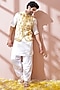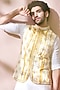 Featuring a white and yellow bundi jacket in blended silk base with tie-dye print and mirror embroidery. It is paired with a rayon tie-dye printed kurta and pleated salwar pants. Perfect wear for a wedding, sangeet or engagement ceremony.