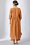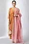 Featuring a copper kurta in chanderi silk base with mirror and silver zari floral embroidery. It is paired with matching cotton pants, a slip, and pink hand block printed dupatta in cotton chanderi pase.