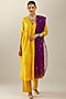Featuring a deep yellow hand-crushed kurta in pure silk base with sequin highlights. It is paired with matching silk straight pants and a contrasting silk organza dupatta having sequins work and gota lace edgings.