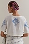 Featuring an off-white saree in cotton chanderi base with blue and green floral hand block print, ricrac lace and beaded tassels. It is paired with a cotton blouse. Style it with oxidised jewellery, kolhapuri flats or block heels, and soft waves for festive gatherings.