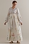 Featuring an off-white maxi dress in silk chanderi base with multi-colored floral hand block print, ricrac lace, round neck, front slit and a tying cord details. Style it with oxidised jewellery, kolhapuri flats or block heels, and soft waves for brunches, festive gatherings, casual outings, vacation wear, or day events.