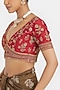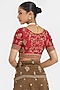 Featuring an olive saree in silk chanderi base with gota piping detail, beads, sequins and dori embroidery. It is paired with a bright red embroidered blouse having side zip and a deep v-neckline. Style it with a choker necklace set and heels for a festive occasion, wedding or engagement ceremony.