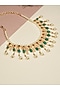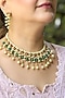 Featuring a gold finish handmade choker necklace studded with green kundan polki, set in brass. It is paired with a matching pair of earrings. This jewellery elevates weddings and festive looks, style it with embellished outfits and heels for a refined, glamorous finish.