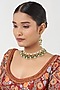 Featuring a gold finish necklace studded with kundan polki and green beads bunches, set in brass. It is paired with a matching pair of earrings.