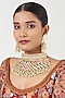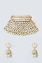 Featuring a gold finish necklace studded with kundan polki, pearl and green bunches, set in brass. It is paired with a matching pair of jhumka earrings.
