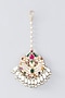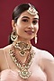 Featuring a gold finish choker necklace studded with multi-colored kundan polki and white beads, set in brass. It is paired with a matching pair of earrings, a long necklace, and a maangtikka.