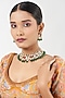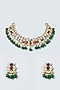 Featuring a gold finish necklace studded with kundan polki, navratna stones and green beads, set in brass. It is paired with a matching pair of earrings.