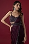 Featuring an aubergine pre-stitched ruffled saree in satin base with cutdana embroidery. It is paired with a raw silk blouse and a belt. Accentuate with dangler earrings and heels for an engagement or sangeet ceremony.