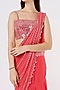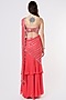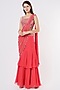 Featuring a bright pink tiered saree in georgette and raw silk base with ruffles and mirror embroidery. It is paired with a matching blouse having mirror work.