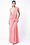 Featuring a bubblegum pink sharara saree in georgette and raw silk base with mirror embroidery. It is paired with a contrasting bustier. Perfect wear for festive occasions, cocktail or wedding ceremonies.