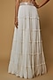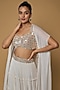 Featuring an ivory cape in raw silk and georgette base with mirror work. It is paired with a matching blouse and a tiered ruffled skirt. Perfect wear for a summer wedding.
