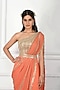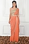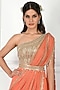 Featuring an orange pre stitched saree in georgette and raw silk base with gold beaded embroidery. It is paired with a contrasting gold one shoulder blouse and a belt having pearl tassels.