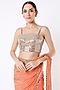Featuring an orange tiered ruffled saree in georgette and raw silk base with mirror embroidery. It is paired with a contrasting blouse.