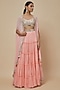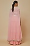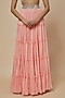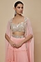 Featuring a pastel pink cape in georgette and raw silk base with mirror work. It is paired with an embroidered bustier and a tiered skirt. Accentuate with statement jewellery and heels for a festive occasion or sangeet ceremony.