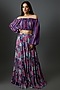 Featuring a blue layered skirt in crepe base with print. It is paired with a matching georgette blouse having printed stripes.