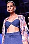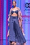 Featuring a blue blouse in crepe base with print. It is paired with a georgette embellished ruffled cape and crepe sharara pants. Style it with hoop earrings for cocktail parties.
