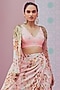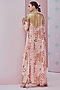 Featuring a light pink cape in georgette base with power shoulder. It is paired with a matching blouse and a modal satin skirt.