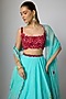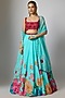 Featuring an aqua blue lehenga in dola silk base with floral print and embroidery. It is paired with a rose pink blouse having sequins and floral hand embroidery, including an aqua organza dupatta having scalloped embroidery. Accentuate it with traditional kundan or meenakari jewellery, a vibrant potli bag, and embellished juttis for a stylish ensemble, ideal for grand festive gatherings or wedding celebrations.