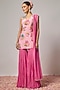 Featuring a blush pink short kurta in pure crepe base with floral print and sequins highlights. It is paired with pink lurex georgette sharara pants and a dupatta having pearl border. Accentuate it with zircon earrings and heels for festive gatherings or sangeet ceremony.