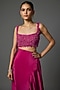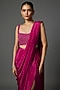 Featuring a pink pre-draped saree in pure crepe base with a high-slit. It is paired with a blouse having glass beads and sequins hand embroidery. Accentuate it with zirconia or swarovski jewellery, embellished heels and a clutch for a sangeet or wedding ceremony.