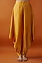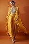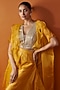 Featuring a mustard shrug in organza base. It is paired with a silk blouse having mirror work and silk satin dhoti pants. Accentuate it with hoop earrings and heels for a complete look.