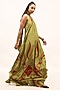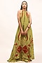 Featuring an olive green maxi dress in viscose crepe base with a halter neck and floral print.