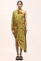 Featuring an olive green one-shoulder kaftan in viscose crepe base with floral print.