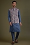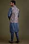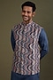 Featuring a multi-coloured bundi jacket in woven fabric base. It is paired with a cotton satin kurta and churidar pants. Perfect wear for a wedding, engagement or sangeet ceremony.
