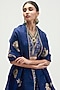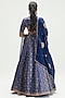 Featuring a sapphire lehenga in silk brocade and silk organza base with brocade print and embroidery. It is paired with a matching blouse and a dupatta.