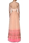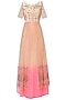 Featuring a nude peach to neon pink ombre kalidaar style gown in net base with illusive neckline hand embroidered with pitta work highlighted using sequins and bugle beads on the bodice and ghera.