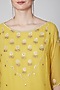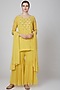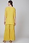 Featuring a yellow kurta in viscose georgette and cupro tabby base with resham, dabka, sequins, and gota embroidery. It is paired with matching sharara pants and a dupatta.
