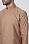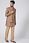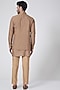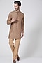Featuring a beige bundi jacket in spun silk base with thread work. It is paired with matching aligarhi pants and a kurta.