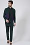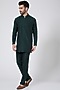 Featuring a dark green and dark blue bundi jacket in spun silk base with overlapping triangles and thread texture. It is paired with a matching kurta and aligarhi pants.