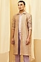 Featuring an oyster beige & lilac mock layered shacket in silk and cotton base with gold geometric foil print. This only contains one piece.