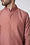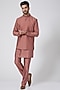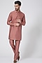 Featuring a salmon pink bundi jacket in spun silk base with thread work. It is paired with matching aligarhi pants and a kurta.