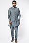 Featuring a teal blue textured bundi jacket in spun silk base. It is paired with a matching short kurta and pyjama pants.