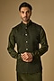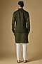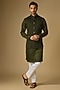 Featuring a dark olive bundi jacket in blended silk base. It is paired with a kurta. Style it with pants and mojaris for a festive occasion, cultural event, sangeet or mehendi ceremony.