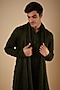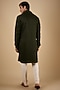 Featuring a dark olive kurta in linen satin base with hand embroidery. It is paired with a matching stole. Style it with white pants for a festive looks.