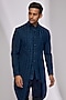 Featuring a navy blue mock layered indo western jacket in velvet base with thread machine and hand embroidery. It is paired with a matching linen satin kurta and suiting breeches.