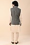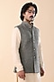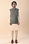 Featuring a washed olive nehru jacket in linen satin base with straight cut, full placket, and shiny gunmetal buttons. Perfect wear for a festive occasion, wedding or sangeet ceremony, exuding traditional charm and timeless elegance.
