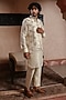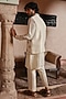 Featuring an almond ivory bundi jacket in zari satin base with zipper and piping detail, including gota, thread and stone embroidery. It is paired with a kurta and pants. Style it with a statement brooch and polished footwear for added elegance. Ideal for weddings, cocktail nights, and formal pre-wedding events.