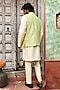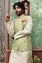Featuring an apple green bundi jacket in tissue jacquard base with peacock motif, gota, thread and french wire embroidery. It is paired with a viscose silk kurta and pants. Style it with a statement brooch and polished footwear for added elegance. Ideal for weddings, cocktail nights, and formal pre-wedding events.