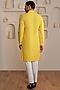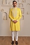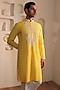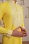 Featuring a yellow kurta in cotton base with resham thread hand embroidery. It is paired with pants. Style it with loafers for a festive occasion, haldi ceremony or an intimate pooja ceremony.