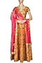 Featuring an orange blouse in silk with gold floral embroidery all over the front and back.. It comes along with orange lehenga in silk with gold floral embroidered kalis and pink dupatta in net with orange embellished border and scattered motifs.