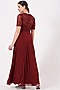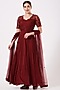 Featuring a reddish maroon anarkali in georgette and net base with resham, cutdana, and sequins hand embroidery. It is paired with a matching dupatta and a waist belt.