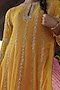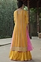 Featuring a yellow anarkali in georgette base with zardosi, pearl, and mirror embroidery. It is paired with a matching lehenga in pure silk base and an organza dupatta.