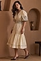 Featuring a beige midi dress in linen base with puff sleeves and embroidery. Accentuate it with minimal jewellery and heels for a complete look.