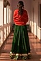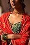 Featuring a green lehenga in handwoven silk base with hand embroidery. It is paired with an embroidered blouse and a red jaal dupatta. Accentuate it with chandbali earrings, embellished block heels and a potli bag for a wedding, mehendi, sangeet or engagement ceremonies.