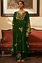 Featuring a green kurta in silk velvet base with zardosi embroidery. It is paired with pants. Accentuate it with chandbali earrings, embellished juttis and a potli bag for a festive occasion, mehendi or engagement ceremonies.