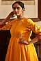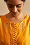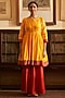 Featuring a yellow short kurta in china silk base with embroidery. It is paired with red sharara pants and a dupatta. Accentuate it with chandbali earrings, embellished block heels and a potli bag for a festive occasion, haldi or engagement ceremonies.